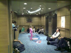 Omtrent som forventa. Massevis av busspensjonister på tur, noen av de 92 bobilene som har vært på treff i Lubeck, (et nytt treff, rogalendinger fra bobilforeningen denne gangen) og ørten ferierende biler og unger og allslags. Båten er stapp full. Og det betyr at det ikke er plass til alle, rett og slett. For å være garantert en sitteplass, må du kjøpe businessbillett. Da er tregt trådløs nett inkludert. Eller så kan du kjøpe sitteplasser i buffetrestauranten, til 220 kr. Da er alt du orker av mat inkludert. Vil du ha noe å gjøre, kan du stå i kø i taxfreebutikken… For lovlydige kunder som oss er prisen på vin omtrent nøyaktig samme som polprisen når vi betaler tollen på 40 kr flasken.