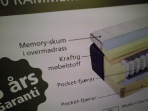 Den ene sengen måtte ha ny madrass, så vi var rundt og kikka. Ingen lett sak! Ikea ble løsningen til slutt, men før det var vi innom noen steder, blant annet jysk. Falt nesten for memoryskummet her… Og måtte ta bilde.