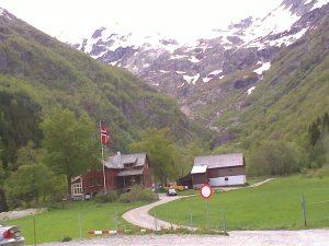 En fjording i veien, sauer i store blomsterenger, hvite bjørkestammer, barn lekende i bunad i gresset, isbre, en foss, snø, fjell og fantastisk utsikt!