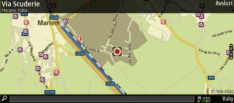 Ikke så mye til bilde, bare en kartdump fra mobilens GPS. Men det viser hvor vi sitter, utenfor et Fiatverksted i Merano og venter på å få bilen vår fikset. Igjen. Vi oppdaget at det var lite guff i airconditonen, noe som ikke var så rart siden fabrikken hadde glemt å montere alle delene. Wingamm ville ikke hjelpe oss med det, derfor måtte vi finne et versted selv. Vi dro hit til Syd-Tyrol, her snakker de tysk, noe som er enklere for oss enn italiensk. Nå krysser vi alle fingre og knær vi har. I varmen.