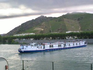 Så fikk vi altså se en skikkelig elvecruisebåt, den kom i går, fortøyde ti meter fra oss, og gikk tidlig i morges. Lå med baugen opp i elven, og snudde før den seilte nedover. Ombord var sånn omtrent 100 amerikanere, litt sånn oh-my-god-amerikanere, som nok syns de 100 metrene bort til sentrum var drøye. Båten het Chardonnay, og var registrert i Dijon, hvem kan vel glemme det?