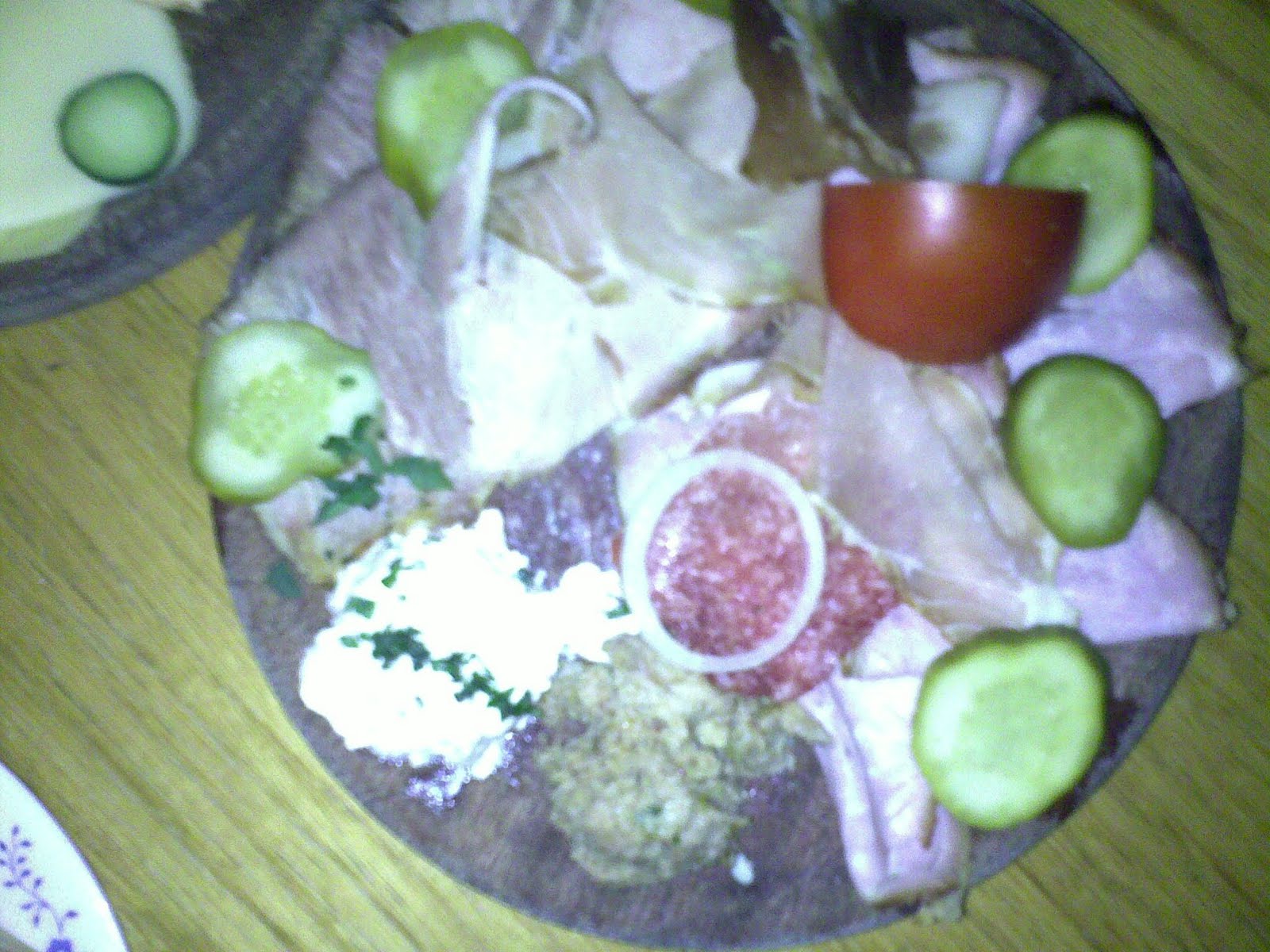 Heuriger hamboeck i Stein har blant annet dette på menyen: kauerjause, blutwurst mit kren, rinderzunge, wurst in essig mit oel, quargel mit butter, presswurst, schafmischkaese, roehes sauerkraut, surfleisch.