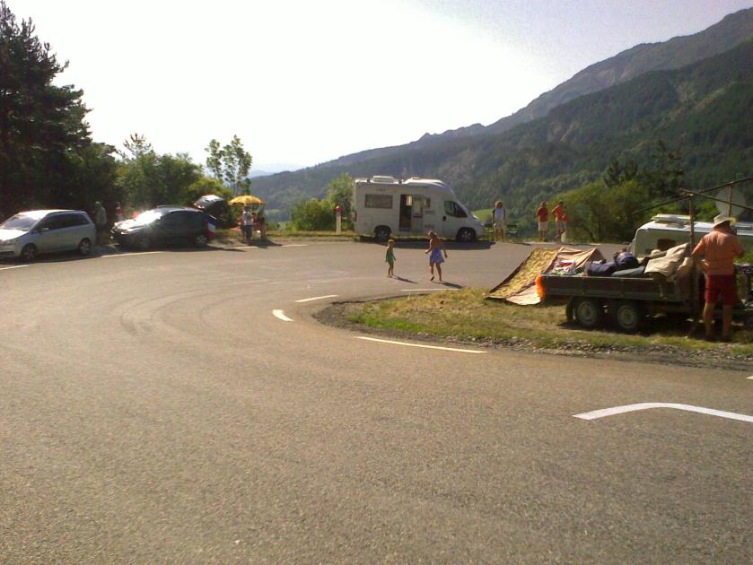 Vi tar en annen vei nedover igjen… Men først skal vi nyte dette da! Vi er i bakken opp mot Col de Cabre, på 1100 m høyde. Plassering her skal være rett før kl 14. Her er det masse bobiler, noen som har campet i telt, unger som skriver navnene på sine store helter i veibanen. Kult!
