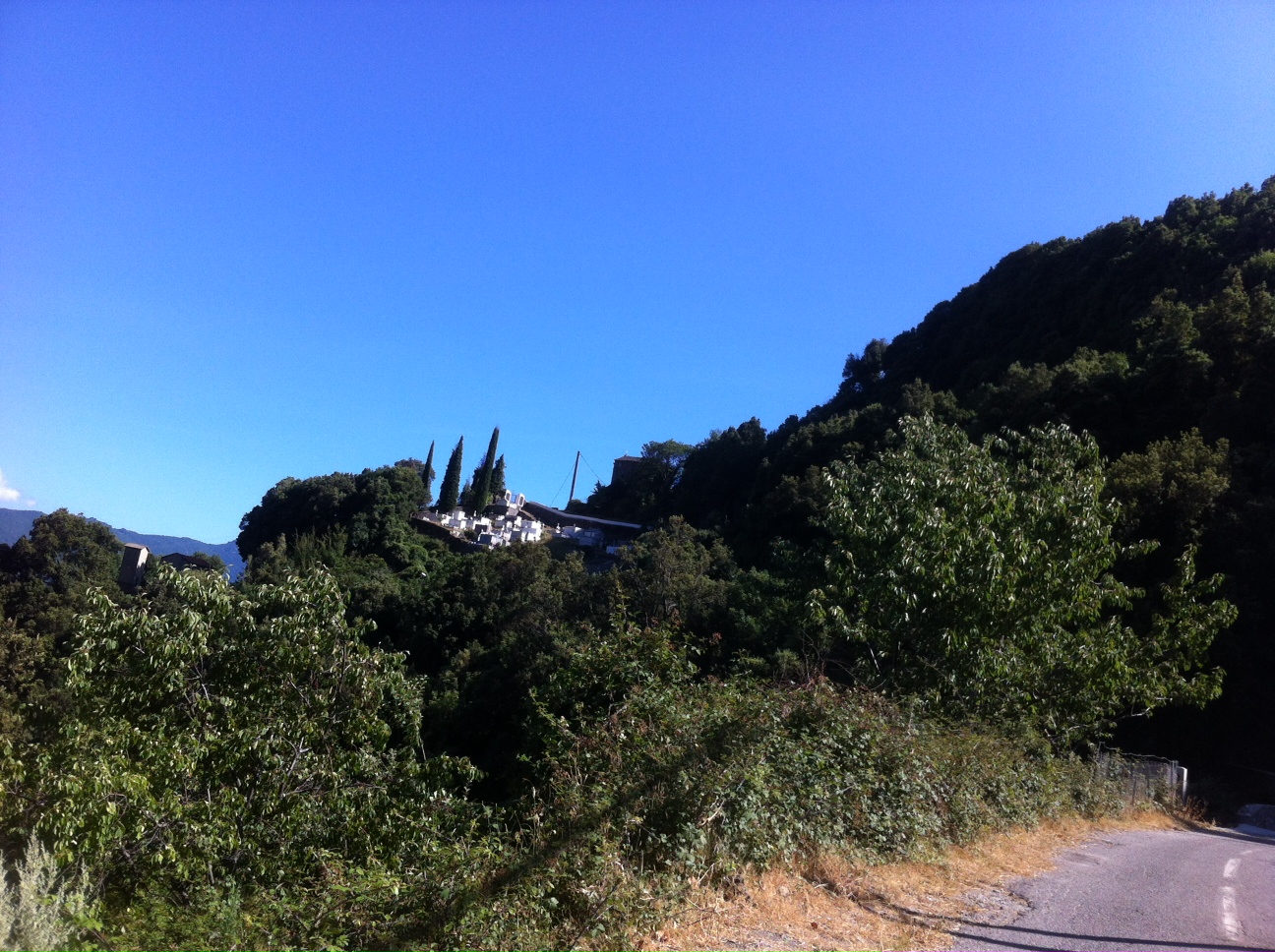 Veiene på Corsica er smale. Mange er definitivt IKKE for bobiler. Da vi kjørte over fjellet i går kjørte vi her, hvor en kirkegård holder på å ramle ned skrenten: