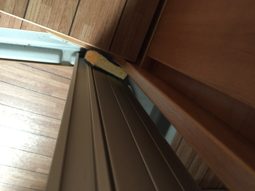 Men det er ting som skrangler. Vår forrige bil var håndlagd og nok spesialtilpasset i alle kroker og kanter. Det var knapt et knyst å høre, hvis ikke jeg hadde glømt en teskje i en kopp i oppvaskkummen, eller et vindu sto åpent… Her er det mest skilleveggen mot badet som dingler og irriterer en smule. Vi har prøvd å antiskrangle den med en svamp, (bildet). Det samme gjelder de fancy vindusgardinene som det er så enkelt å trekke for. Ser kult og enkelt ut, men virker «billig» og det er jeg litt overrasket over. Regner med vi finner løsninger på dette etterhvert!