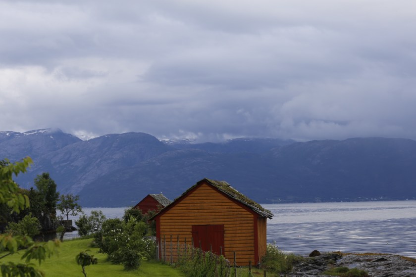 Men tilbake til turen. Så flott det var! Definitivt mye vær, og lite av det var varmt. Sjarmerende veistrekninger, flott arkitektur, høye fjell, og idylliske bygder. Strandebarm, Fosse, Jondal, Tysnes… Vanligvis kjører vi til og fra Odda, og det er det. Dette var en skjønn omvei. Vi overnattet i Strandebarm på campingplassen. Der var vi nesten alene. Traff disse da, litt spesielt!