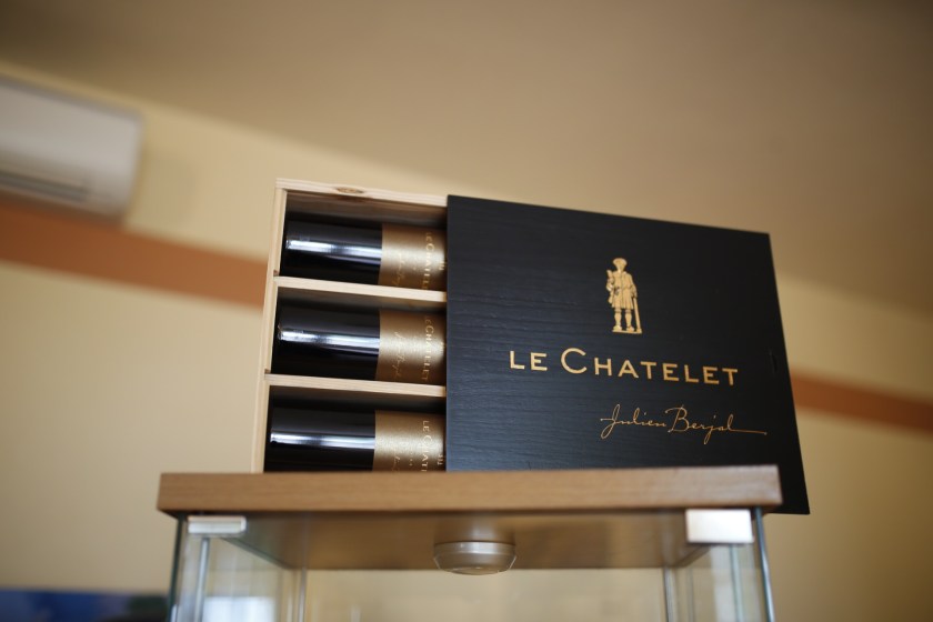 Like bortenfor tok vi nok en vilkårlig sving opp på høyre side. En lang gårdsvei førte opp til en haug, med et slott. Vi ringte på, og Patrick kom og viste oss, fortalte og vi smakte. Masse. Fem viner, pluss en Sauterne, og så fikk vi en slurk til, og to flasker på kjøpet (de til 55 euro…). Chateau Le Chatelet var stedet der vi havnet, tilfeldig, og igjen ble møtt med åpne armer og velvilje. Grand cru classé ble det noen av, pluss en kasse hverdags-Bordeaux, og litt til spesielle lørdager. Han var veldig blid da vi dro, for å si det slik, men det var vi også.