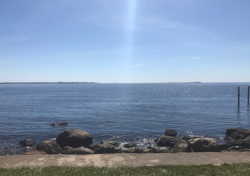 Vi er like utenfor Mystic, et steinkast fra grensen til Rhode Island. Været er nydelig. Skikkelig vårvær, vi har fått farge begge to.