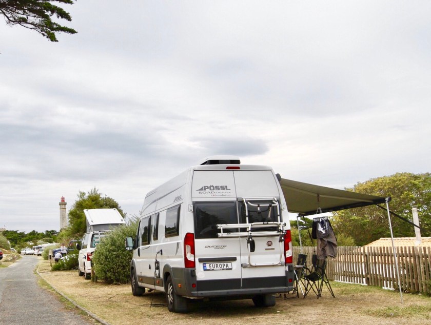 Vi bor ved fyret Les Baleines, helt nord, og fikk såvidt plass i tre netter. Måtte bytte pitch etter to, og det er ganske folksomt. Men fint her ute. Som på Noirmoutier lager de poteter og salt, og i tillegg masse vin. Til og med cognac, med et hint av salt, finnes her. I tillegg er de stolt over eslene sine, som står på utstilling på en mark, noen av dem. SVÆRE og raggete. Tok en stund før vi forsto at det var esler.