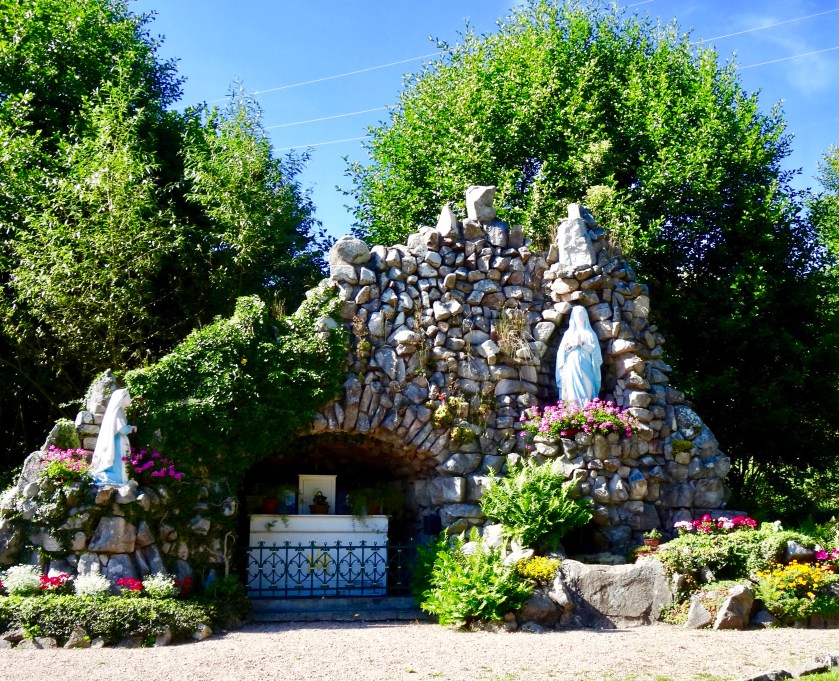 Geishouse har ellers nesten ingenting å by på. Men en flott sti mellom Lourdes-grotten og opp til kirken fant vi. Om den blå damen er Bernadette, er vi ikke sikre på. Kirken har klokker som kimer over hele dalen, fire ganger i timen, og ringer til messe i tillegg.