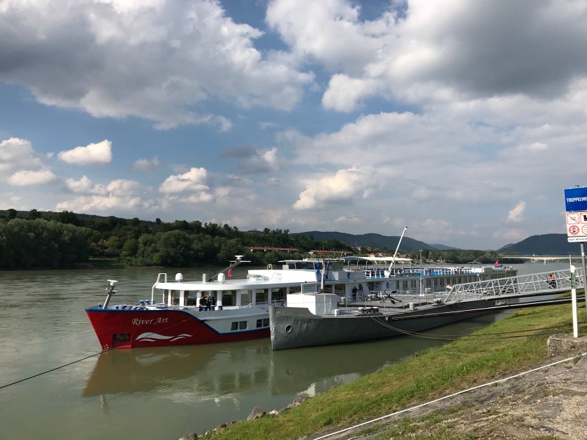 Da sitter vi ved bredden av Donau og ser elvecruiserne dra forbi. Melk heter byen og vi er en time fra Wien.