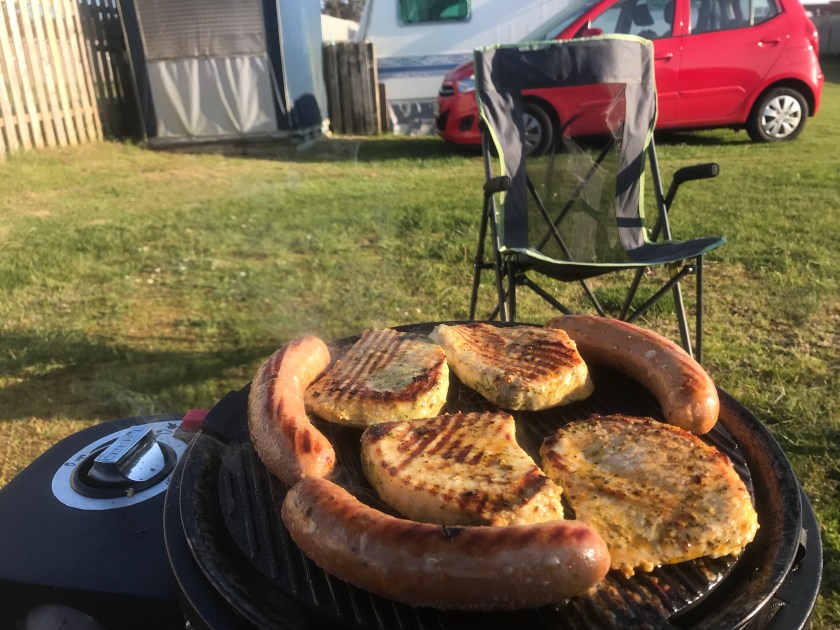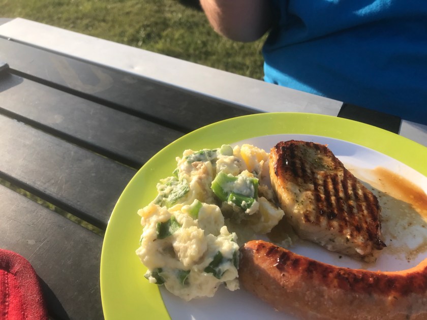 Men så kom vi til sjarmerende Løkken, og Danmark beste og koseligste campingplass 🙂 i følge eierne i alle fall. Rolig og greit! Og grillduften over hele plassen! Danskene er gode på det! På oss ble det marinerte svinekoteletter og litt pølse, og en varm potetsalat.