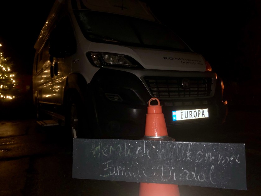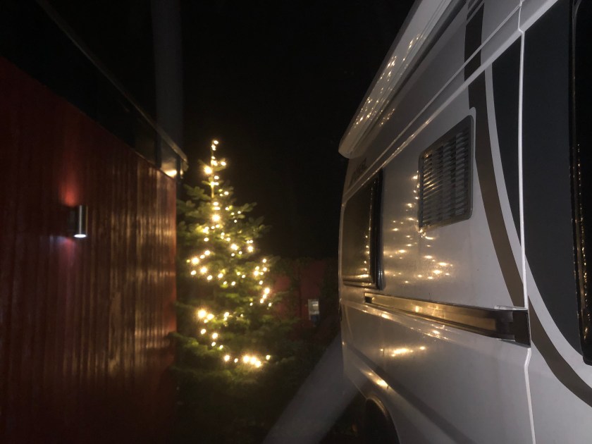 Ble tidlig kveld på oss, og vi var klare for 750 kilometer fra Hirtshals og hit. Det er langt. Vi stoppa og bunkret litt på grensen, men ellers gikk det i ett! Når vi reiste var det skodde og mørkt, og skodde fulgte oss nesten til Rostock. Nå er det bare mørkt, men vi fant fram, og her var en koselig hilsen til oss. vi har til og med vårt eget juletre 🎄🎄😃
