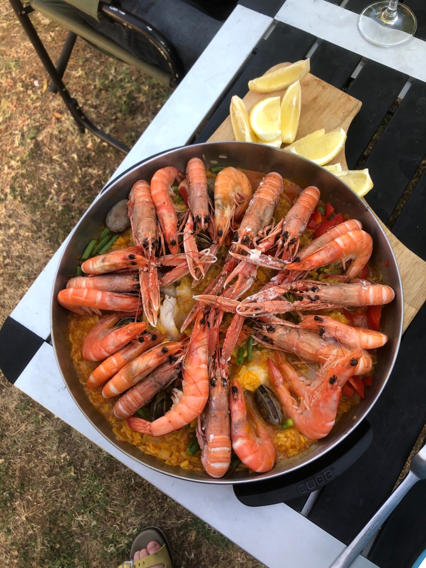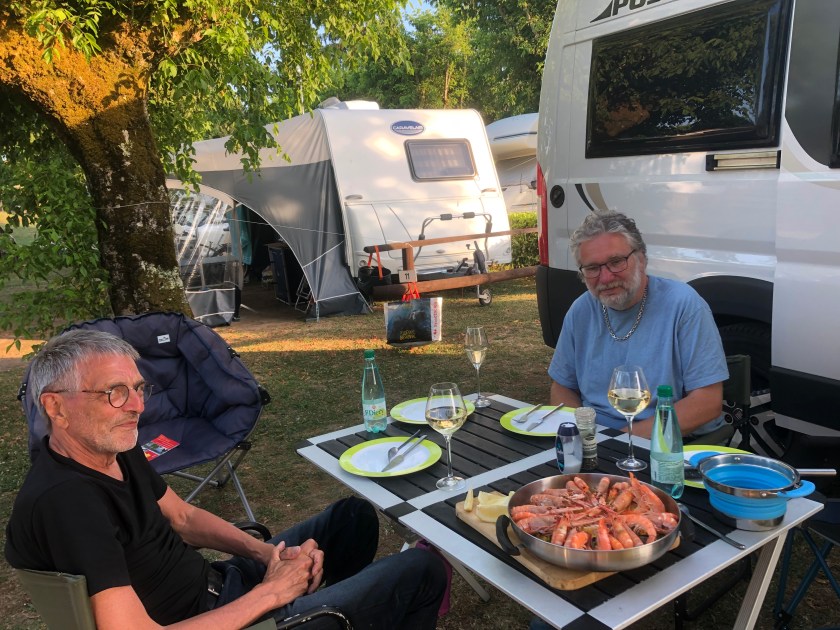 Jammen dukka det ikke opp en av Bjørns venner på campingen. Heikki ble med på både middag og frokost, vi hadde god mat. Han farter rundt i hele ti uker, med en elbil fra Norge. Sprekt. Koselig var det, det hender jo at det er godt å snakke med andre enn hverandre hele tiden! 🙂