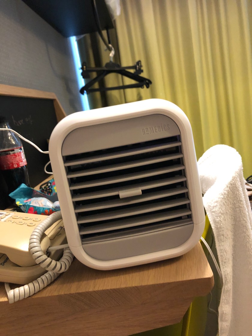 Det er varmt her, opp mot 40 innimellom og i alle fall midt på 30-tallet hele tiden. Vi går i skyggen, later som ingenting nå svetten spruter, og dusjer fire ganger til dagen. I kaldt vann. Det er aircondition her på hotellet, men den tar nok bare ti av gradene på toppen, så i dag var vi innom og kjøpte en liten en. Veldig hendig portabel airconditionvifte med vann i, som egentlig ødela ettermiddagshvilen. Det ble iskaldt! Supereffektiv altså 🙂