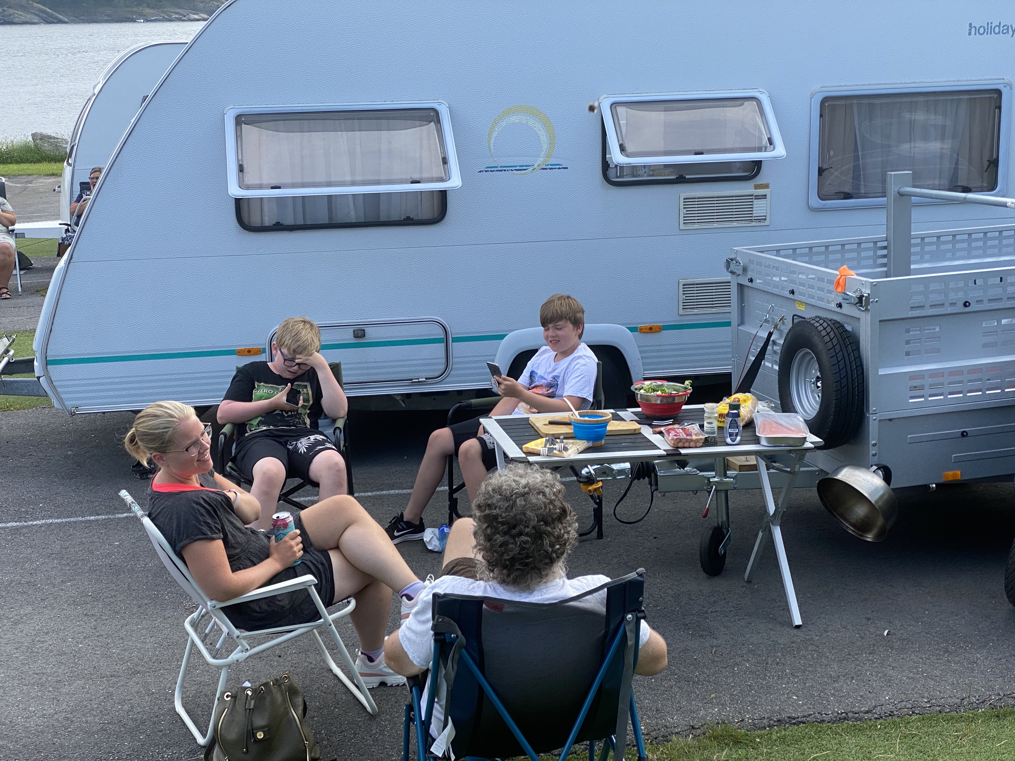 Vi har tatt sørover og fått følge av barn og barnebarn 😀 Her er det bading og frisk luft så det holder. Vi kikker bort på danskebåten og lengter litt. Men bra på Kristiansand feriesenter og!