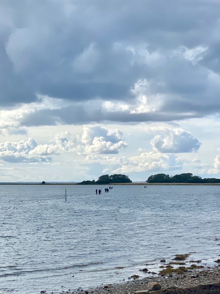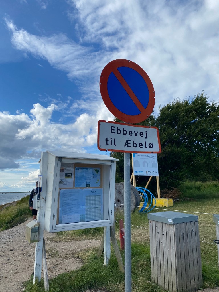 Vi tok ikke turen, men det går altså. Det er en tidevannsvei over til Æbelø, der du kan vasse over. Hele turen er på 15 kilometer, og du bør vel helst klare det på EN fjære-tid, for å ikke bli for våt! Det minner veldig om lengre sør i Europa, og tidevannspassasjen mellom fastlandet og Noirmoutier. (Ja, vi lengter).
