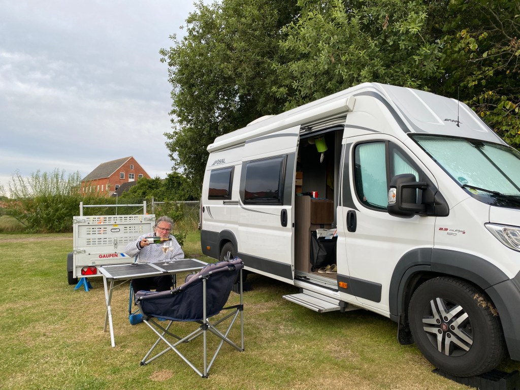 Vi er i Bogense, nord på Fyn. Her er det tre flotte campingplasser som er ganske så fulle, stort sett av dansker. Jeg tror nok det er litt «feriere i eget land» også her. Vi bestilte på forhånd, og har fått en plass med rolige fastliggere som naboer.