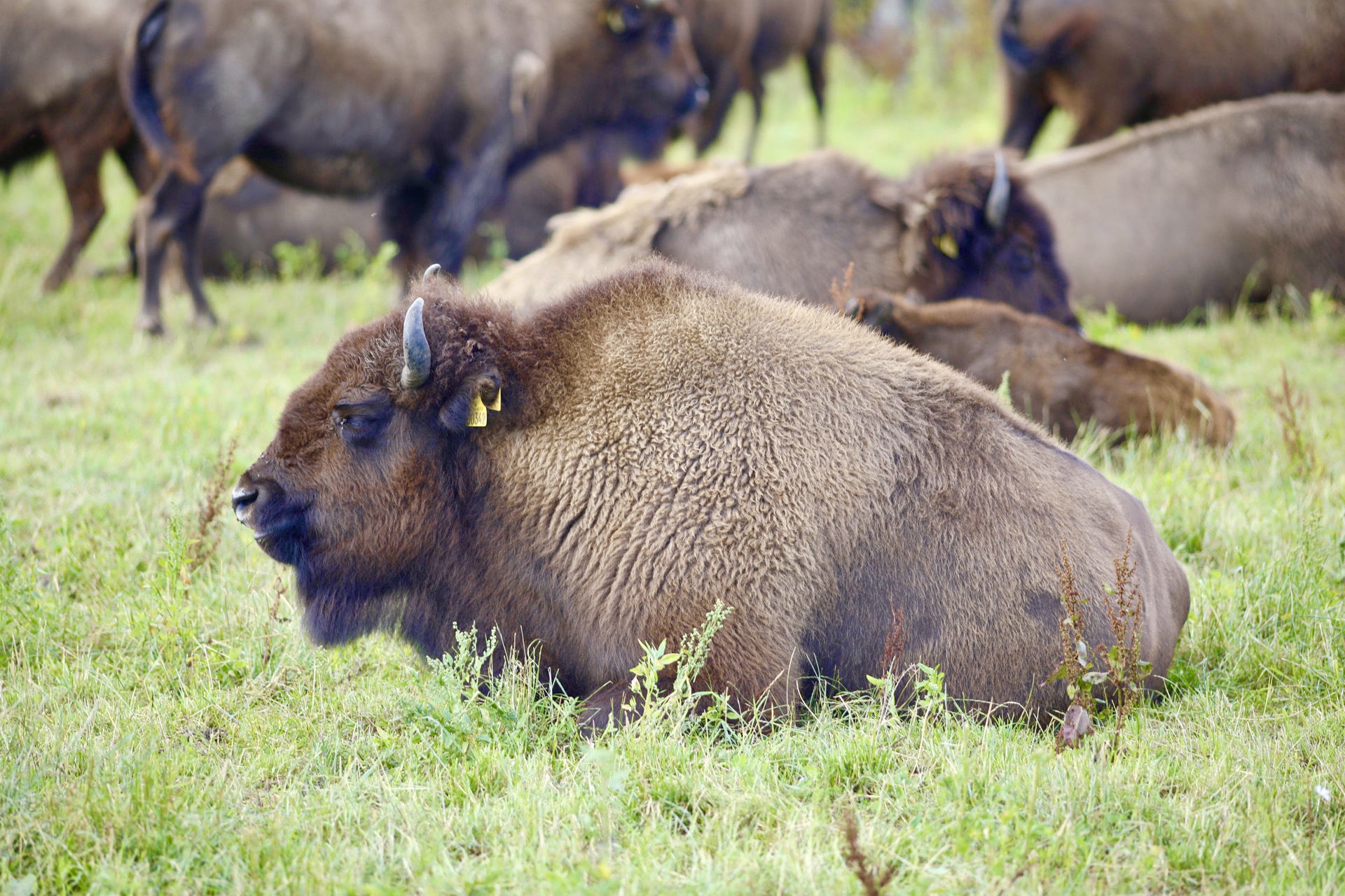 I Ditlevsdal bor det nemlig noen store flokker, og vi var med på tur for å få et nærmere blikk på de svære dyrene. 6-700 kilo tunge, og i stand til å springe i 50 kilometer i timen. Ganske imponerende, selv om de så relativt fredelige ut. Kalvene var jo bare søte, med lysebrun pels, noen fikk fremdeles melk fra mammaen.