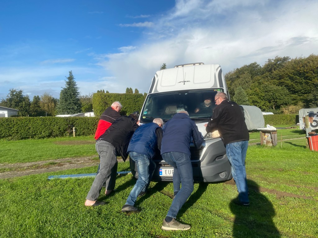 Lørdag formiddag, på vei nordover til Klim Strandleir. Nå vet vi hvor mange menn som trengs for å dytte oss løs. Mange. Minst fem.