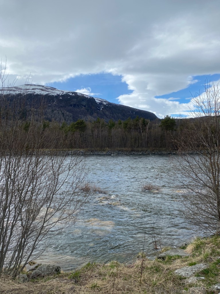 Vi er på Granmo camping, som så mer idyllisk ut på nettsidene. Elva (Driva) er stor, det renner overalt. Snøen forsvant herfra for to helger siden, så det ble litt gåsunger og vårsprett på ny. Et relativt sjarmerende fenomen for alle allergikere!