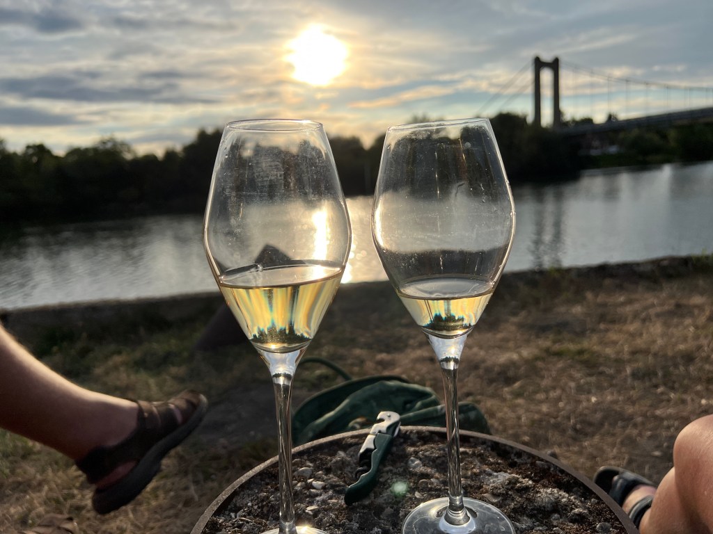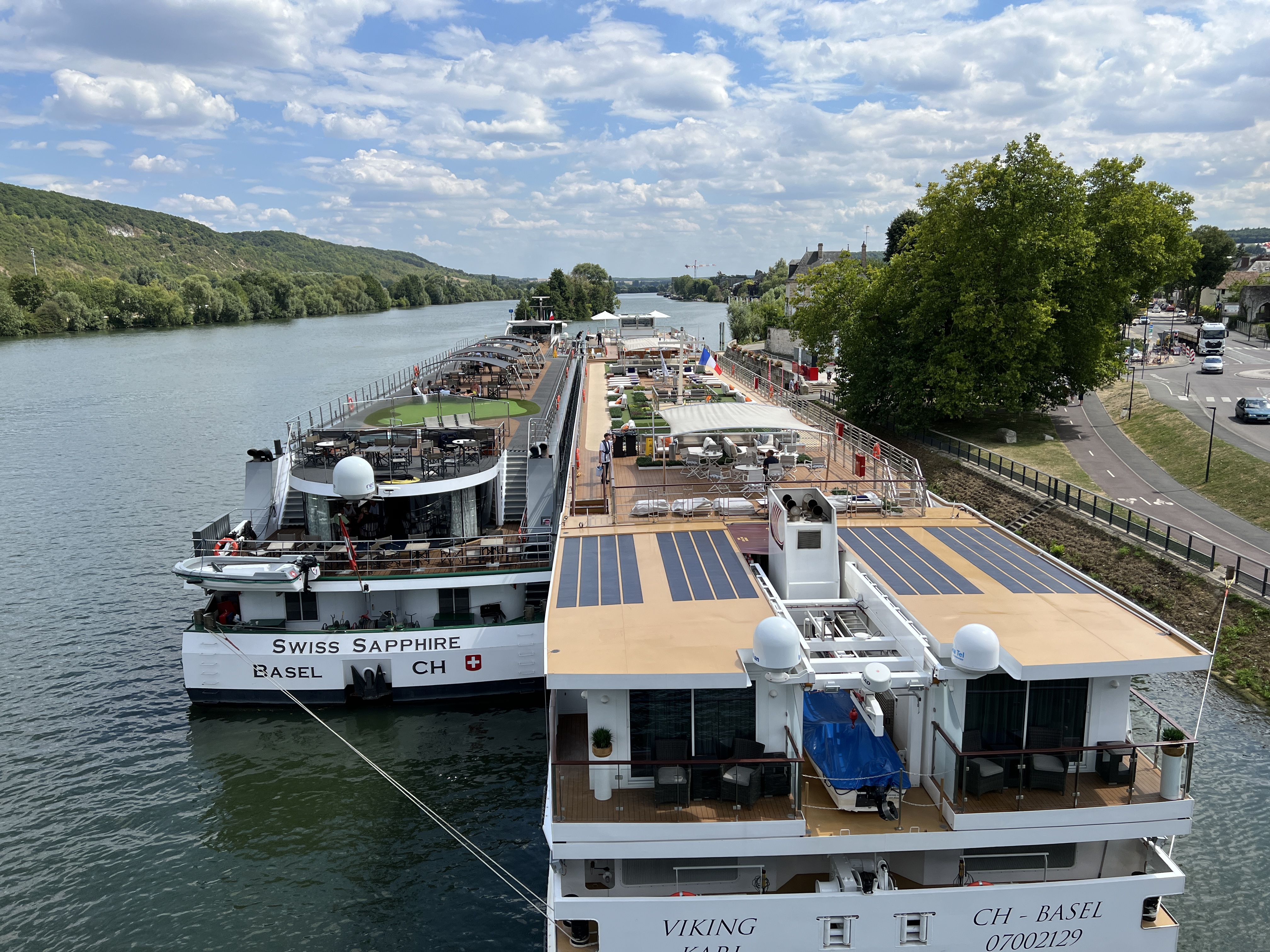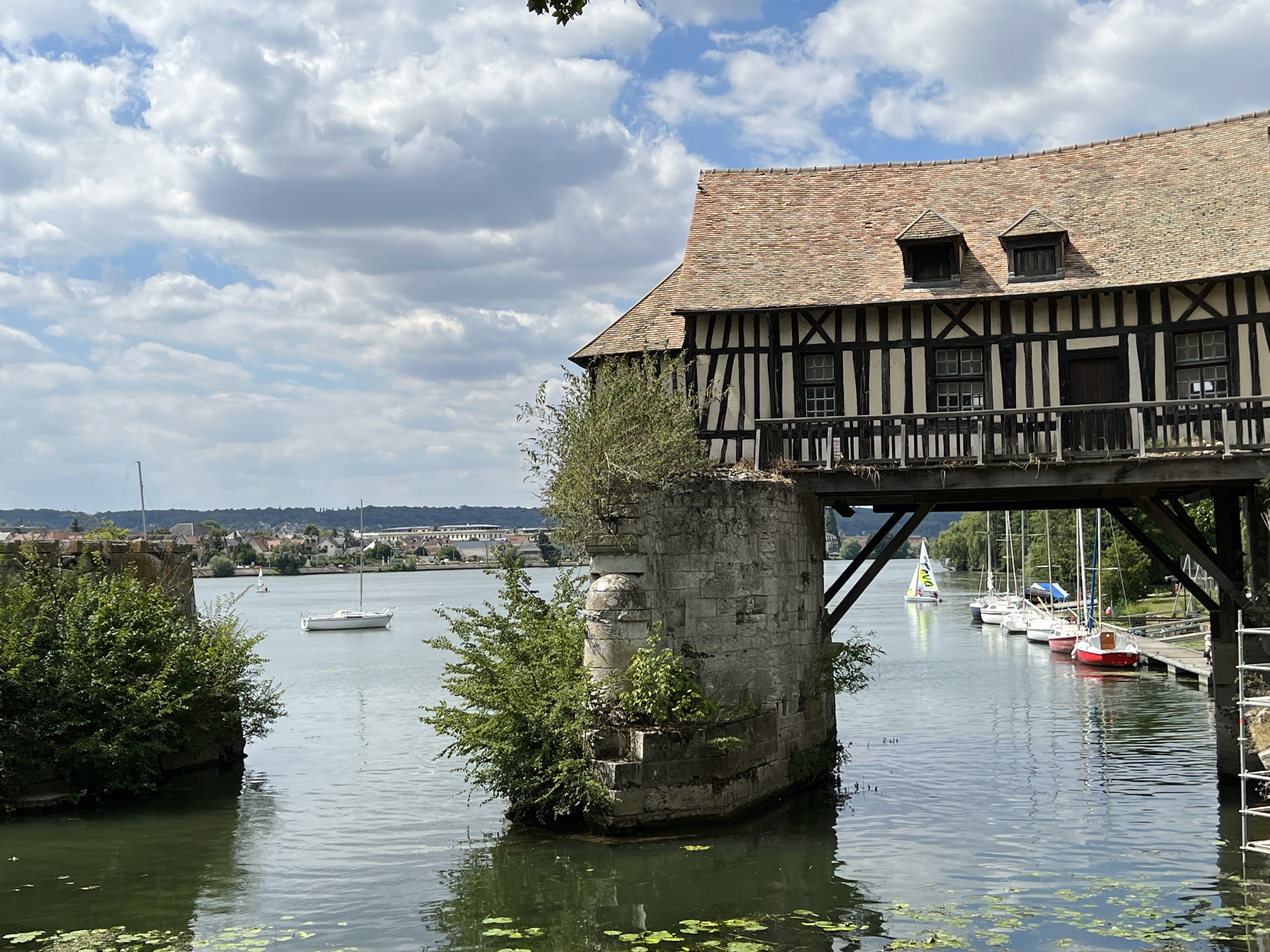 I dag har vi vært i Vernon, en sjarmerende perle, også langs Seinen. Kjekk elv det der! Det er mange små landsbyer og mye sjarm langs veien. Vi kjørte motorsykkel, uten de store sklisikre buksene, det er bare for varmt. Min er i tillegg trang som en tights og helt svart. Det er drøyt 30 grader. Her i Frankrike er det ikke påbudt med den slags utstyr, eneste du må ha er hjelm, selvfølgelig, og hansker. Uten dem, får du bot! Men vil vil jo helst være sikre da 🙂