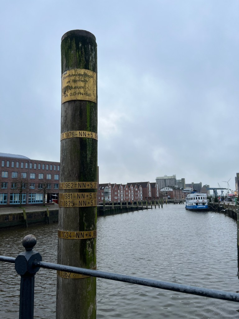 Men Husum altså. Knut (Randem) i Bobilverden (https://bobilverden.no/gra-by-havet/) besøkte denne siden av Tyskland for noen år siden, ta en titt her altså. Det er en koselig by. Litt kaldt og surt i romjulen, og alle glüweinbodene var tatt vekk. Men kos uansett. Som ellers i Vesterhavet, denne byen (i likhet med Ribe i Danmark) har hatt sin andel av storflom. I 1634 skyldte havet innover land, og sto 1,7 meter over gulvet i domkirken i Ribe, mens den totale vannstanden var hele seks meter over normalt. Tenk om det skulle skjedd i Stavanger? Eller Bergen? På Nordstrand (vest for Husum) gikk sjøen gjennom 44 diker, altså voller satt opp for å forhindre akkurat dette. Mange drukna, langs hele kysten. Stormflosøyler som denne står i mange av byene langs kysten. Det er ganske nifst å se på, for landet er flatt!