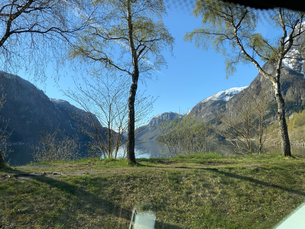 Vi endte her i stedet. Her har det vært dønn stille hele natten, bortsett fra en tjeld, som piper litt, den er omtrent tam. Dagens utsikt fra Trolltunga camping i Odda (Trolltunga er noen mil vekke da).
