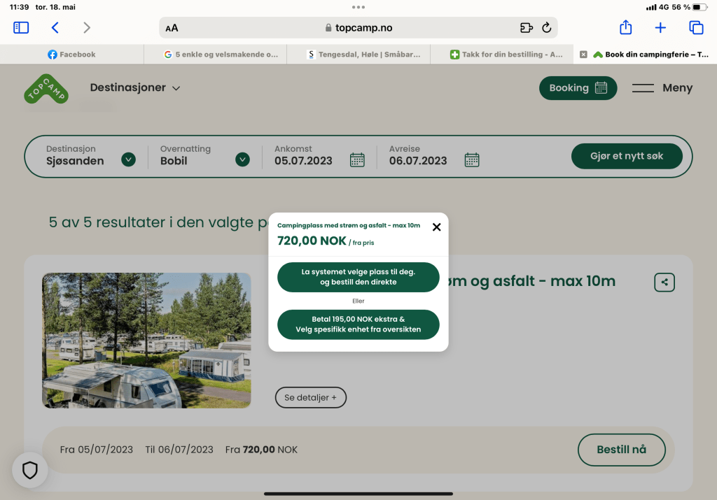 Når vi skal sørover til sommeren, blir det også en natt her, på gressplassen, der det er litt trangere og litt mer humpete vei. Jeg sjekka de flotteste plassene, det koster 915 kroner, om du vil velge plassen din selv. (Se bildet). I tillegg syns jeg det er veldig rart at når du bestiller, er det et bestillingsgebyr på 200, som du merkelig nok sparer inn igjen på «Online rabattbestilling». Er det bare for å få folk til å tror at de får rabatt på noe? Det er ingen oversikt over priser noe sted, hvis du ikke starter en bestilling. Men et «bestillingsgebyr»? Hvem betaler egentlig dette?