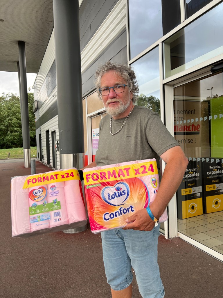 Vi har shoppa litt i dag, Decathlon og Leclerc, vin og doruller. Høres kanskje dumt ut med doruller… Men altså 48 doruller for 16 euro, det er vel en god deal. Hjemme koster doruller til camping i 100 kroner minst for en pakke med seks. Og her har de ruller som passer dårlige rør, til og med pappen løser seg opp i vann!