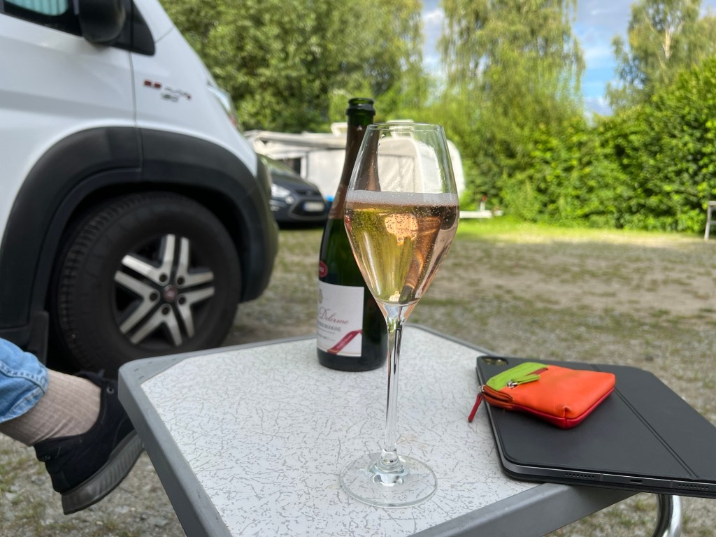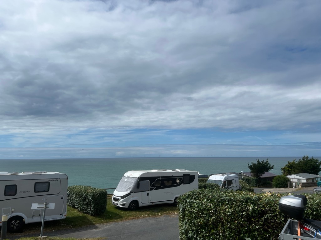 Her har vi en flott pitch, litt tricky å få på plass motorsykkelhengeren, for det er litt bratt. Men det går jo fint. I dag skal vi valse rundt i byen, og i morgen blir det litt kjøring, tenker jeg, selv om det er en veldig trang by med smale veier og alt for mange biler. Kanskje vi tar til Etretat! 🙂
