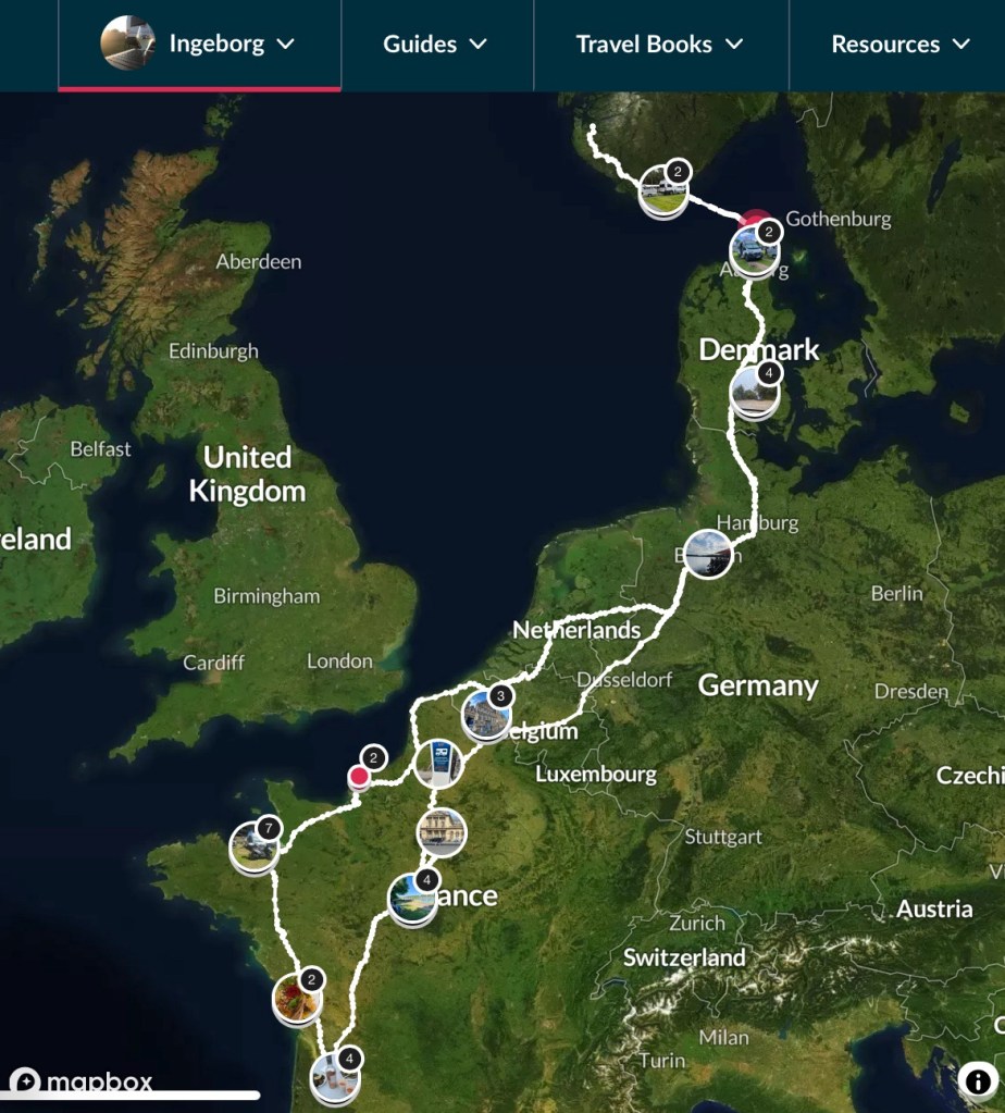 Det er dag 38, vi har vært fem netter og raske biler i Danmark, to i Tyskland, en i Belgia og resten fordelt på sju forskjellige steder i Frankrike! Det ender med omtrent 6500 kilometer totalt! Det ble jo noen på motorsykkel og, og noen togturer og en og annen buss! Alle krinkelkroker kan du se på Polarsteps!