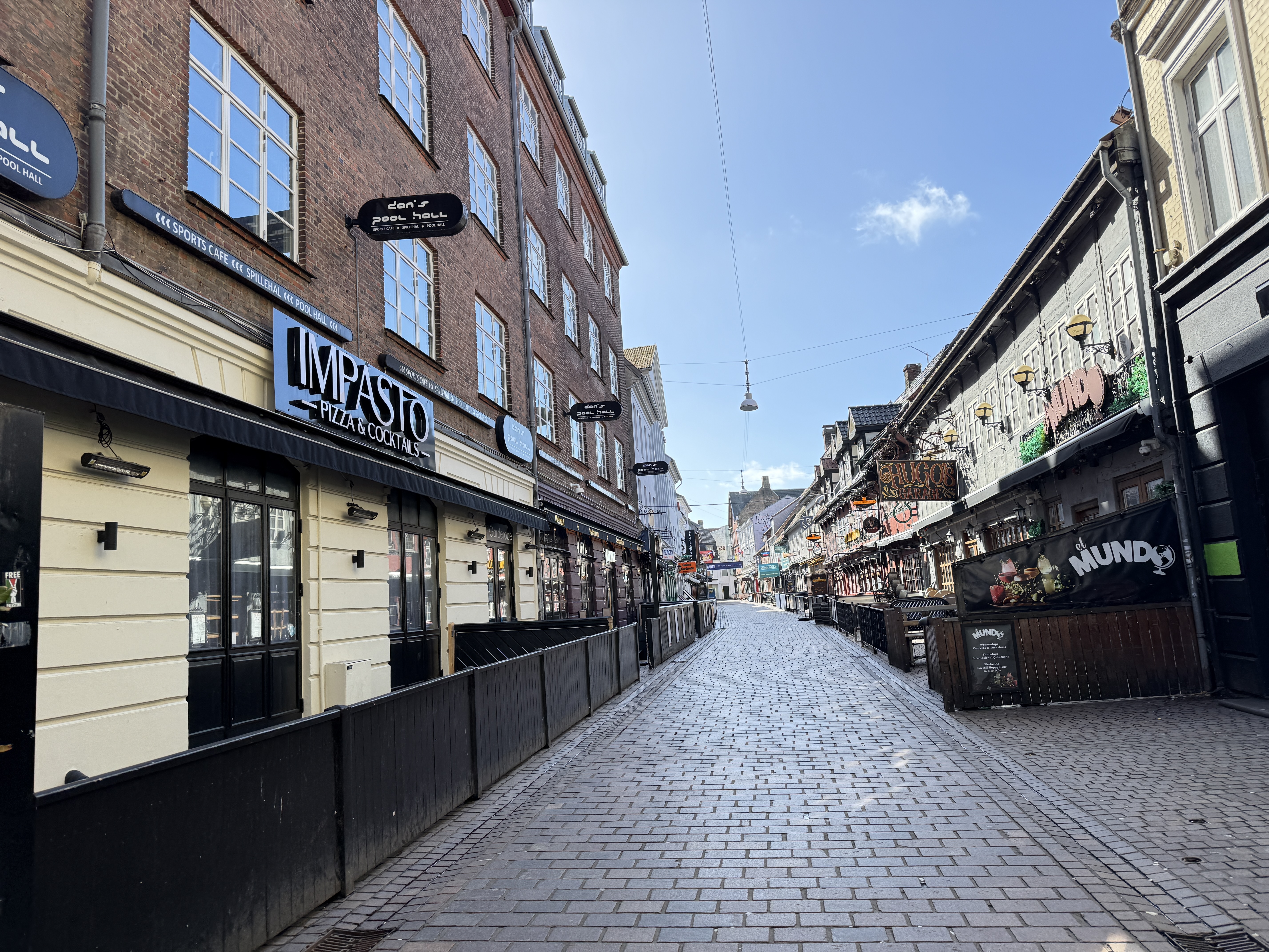 Vi vandra rundt i Aalborg. Plutselig var gågaten stengt, en politibil sto foran. Jeg sa til Bjørn, at sist vi var i en sånn situasjon, var en person nettopp skutt. Det var i julen i Ajaccio, på Corsica. Men Aalborg?